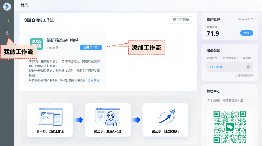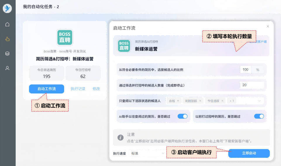 进入<我的工作流>页,一键启动运行,可设置本轮处理简历的数量,也可以要求AI只查看在线/最近活跃的简历。