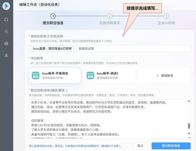 提交岗位JD,AI会分析出招聘要求(如:必要条件、加分项等,你也可以进一步修正招聘要求)。