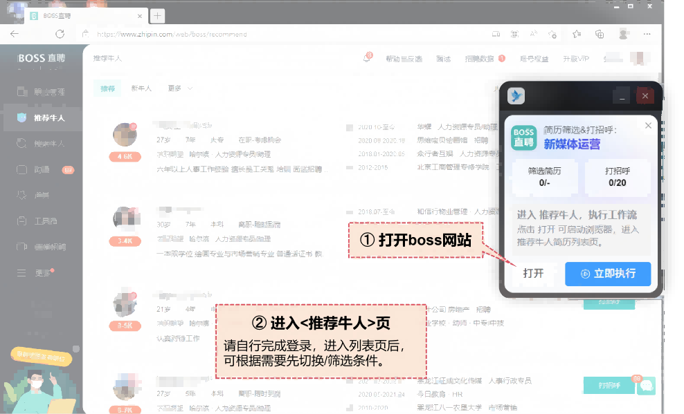 客户端启动后,点击<打开>进入招聘网站,请自行完成登录。进入 推荐牛人 简历列表页后,可根据需要先切换/筛选条件。然后,点击<立即执行>,即可开始自动化执行。