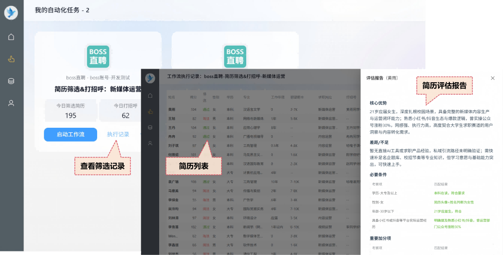 进入<执行记录>页,可查看AI筛选过的每份简历,包括:通过/淘汰、候选人基本信息、简历评估报告。你可以据此评估AI的执行效果,修改工作流配置(比如:收紧或放松招聘要求、调整打招呼风格等)。